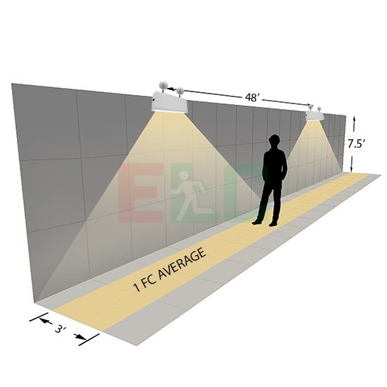 Suggested mounting height of 7.5ft illuminates 1 footcandle (FC) spaced at 35ft for a 3ft path of egress.